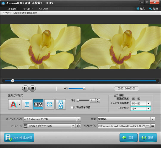 出力の3Dモードを選択、3Dの深さを調整、左目/右目の映像を切替、また、出力のディスプレイ解像度/アスペクト比を設定することができます。そして、プレビューウィンドウで、出力の3Dビデオ効果をプレビューすることもできます。