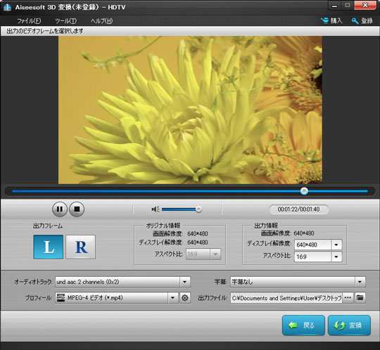 必要に応じて、「L」或いは「R」ボタンをクリックして、出力ビデオとして、左目或いは右目の映像を選択します。