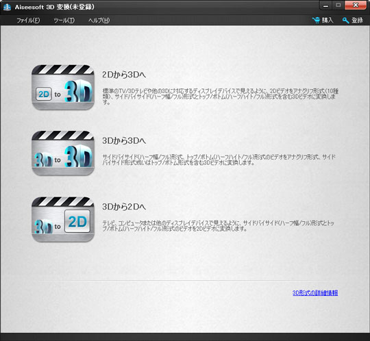 「3Dから2Dへ」ボタンをクリックして、3Dから2Dへのインタフェースに入ります。それから、必要の応じて、サイドバイサイド(ハーフ幅/フル)形式或いはトップ/ボトム(ハーフハイト/フル)形式の3Dビデオを2Dビデオに変換できます。