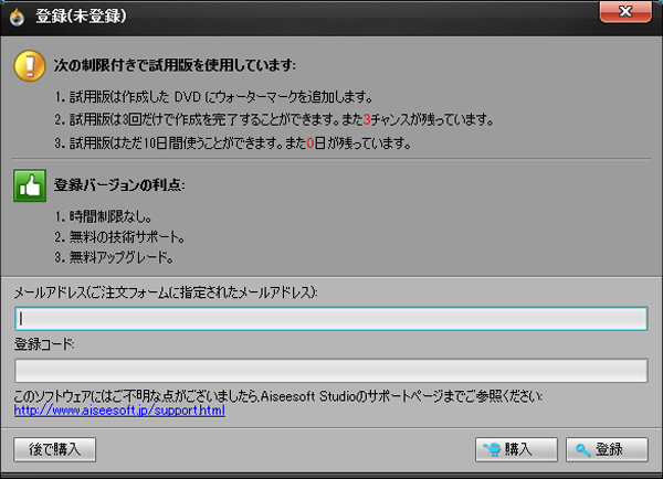 ご注意: 最初のステップと最後のステップの他のステップは順番の制限がありません。それに、必要に応じて、「オーディオトラックと字幕の追加」、「環境設定の編集」、「DVDメニューの編集」が自由に使えます。