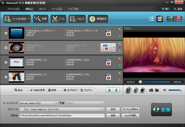 Aiseesoft FLV 動画変換は専門的なFLV 変換ソフトで、FLVとYoutubeビデオをほかの多くのビデオとオーディオフォーマットに高画質且つ高速度に変換できます。