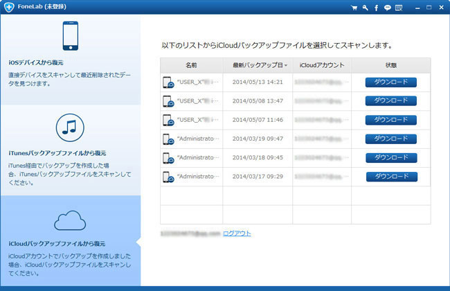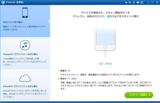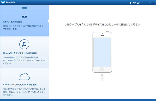 Aiseesoft FoneLabはiOSデバイスのアシスタントとして、データを簡単且つ効率的に復元できます。したがって、デバイスの脱獄やシステムのアップグレードなどによるデータ損失が避けられます。このソフトは主に三つの方法でデータの復元作業を行います。一つは直接にデバイスをスキャンして削除されたデータをリカバリーすることで、一つはiTunesのバックアップを通して復元する方法です。もう一つはiCloudバックアップファイルからデータを復元する方法です。