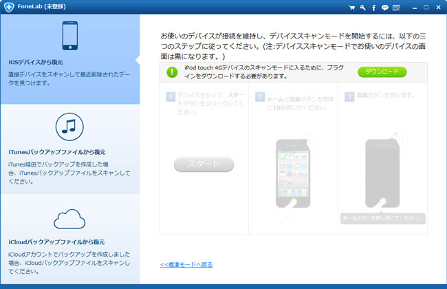 ステップ 1. プログラムを実行し、「iOSデバイスから復元」モードを選択してデバイスを接続します。