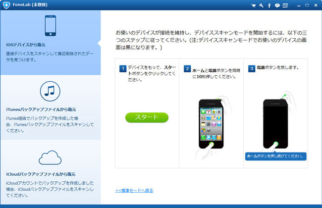 1.デバイスを保持したまま、「データ復元」の画面上の「開始」ボタンをクリックしてください。