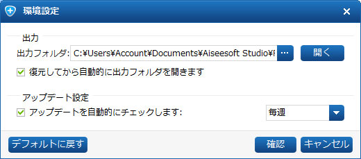 出力: 出力フォルダの保存場所を選択し、復元した後自動的にに出力フォルダを開く場合は、対応するオプションをチェックします。