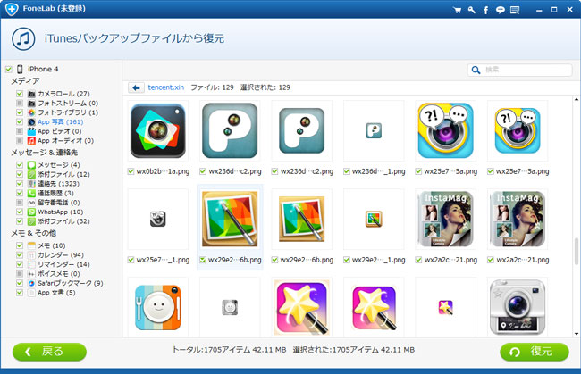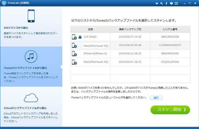 Aiseesoft FoneLab のもう一つの復元モードはiTunesバックアップを利用してデータを復元する方法を通じて紛失したデータを取得するということです。バックアップファイルにあるデータをスキャンしてデータを復元できます。