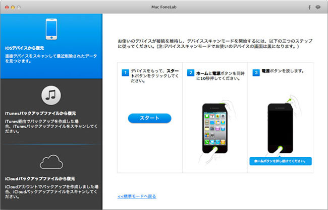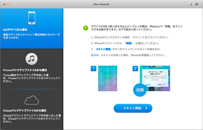 Aiseesoft Mac FoneLabはiOSデバイスのアシスタントとして、データを簡単且つ効率的に復元できます。したがって、デバイスの脱獄やシステムのアップグレードなどによるデータ損失が避けられます。このソフトは主に三つの方法でデータの復元作業を行います。一つは直接にデバイスをスキャンして削除されたデータをリカバリーすることで、一つはiTunesのバックアップを通して復元する方法です。もう一つはiCloudバックアップファイルからデータを復元する方法です。