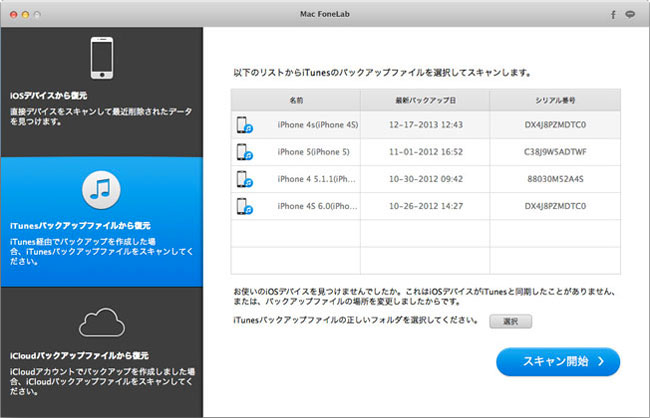 Aiseesoft Mac FoneLab のもう一つの復元モードはiTunesバックアップを利用してデータを復元する方法を通じて紛失したデータを取得するということです。バックアップファイルにあるデータをスキャンしてデータを復元できます。