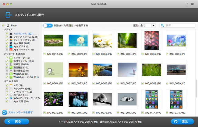 Aiseesoft Mac FoneLab はデバイスから削除された連絡先、メッセージ、通話履歴、カレンダー、ノート、リマインダーとSafariブックマークを復元できるほか、デバイスに保存しているほかのデータファイル、例えば、カメラロール、フォトストリーム、メッセージ添付ファイル、ボイスメモをスキャンするのもできます。同時に、すべてのコンテンツの下のファイルもエクスポートできます。