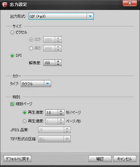 1. GIFとTIFFのような形式を出力する場合は、「複数ページ」を選択して、出力画像を一つのファイルに保存します。また、GIF形式に再生速度を設定できます。