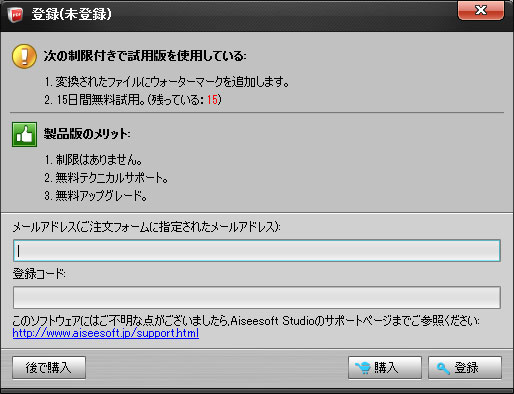 Aiseesoftはお客様からのご質問やご提案を大歓迎です。ご遠慮なく次のメールアドレスに御問い合わせください:support@fonelab.jp。こちらのカスタマーサービススタッフは1営業日以内にご返答いたします。