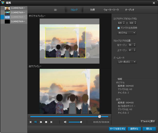 3)ズームモード: - 四つの方式があります:レターボックス、ミディアム、パンスキャン、全画面選択するとき、下の出力プレビューで効果を確認できます。
