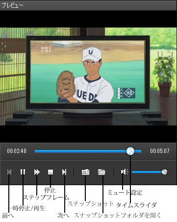 タイムスライダ: タイムスライダをドラッグして画面を移動してプレビューできます。