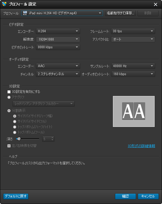 ヒント: サイドバイサイド(フル)/トップ/ボトム(フル)では、出力ファイルの幅/高さは出力プロフィールの解像度の2倍になりますので、デバイスが出力動画の解像度をサポートするかどうかを確認する必要があります。