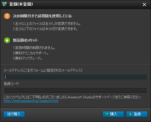 ヒント:登録するとき、「メールアドレス」にソフトを注文するときのメールアドレスを入力し、「登録コード」にメールアドレスに送りました登録コード(ライセンスキー)を入力してくださいませ。