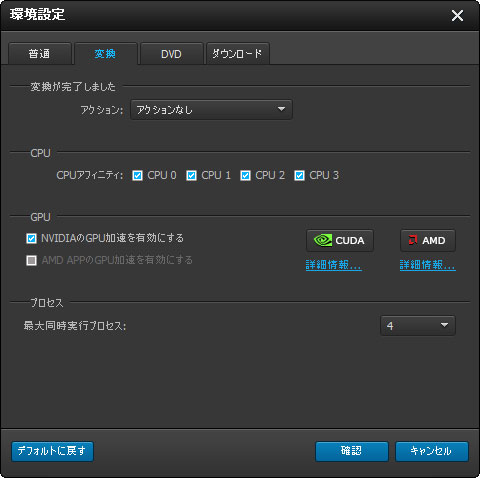 1. 速度を高めるために、メインインターフェースでCUDA 或いは AMD 加速ボタンをクリックしてよろしいです。それとも、環境設定パネルを開き、GPUに対応するオプションをチェックしてもよろしいです。