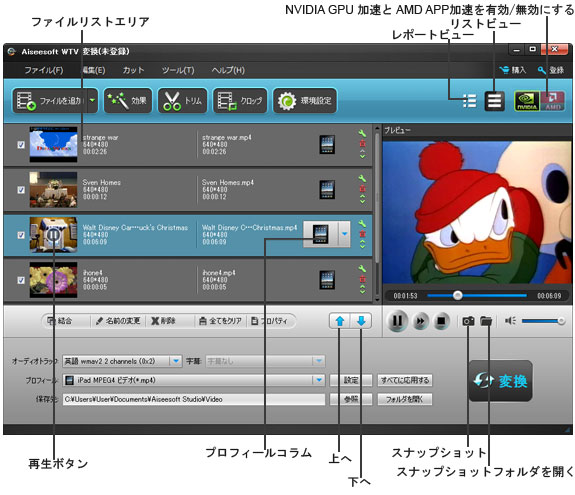 以上の操作が終わってから、ロードされたファイルリストで変換したいファイルを選択して、それから、「変換」ボタンをクリックして、ファイルの変換が始まります。
